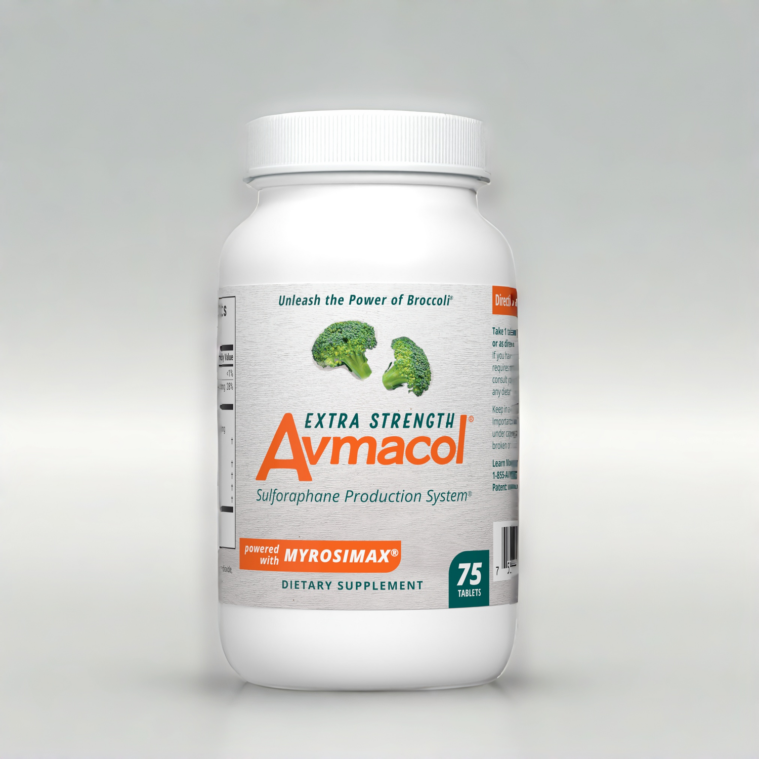 Avmacol Extra Strength is a patented sulforaphane supplement that supplies both glucoraphanin (the sulforaphane precursor) and active myrosinase enzyme, enabling your body to produce sulforaphane naturally — plus added support from maitake mushroom extract for detoxification and immune health.